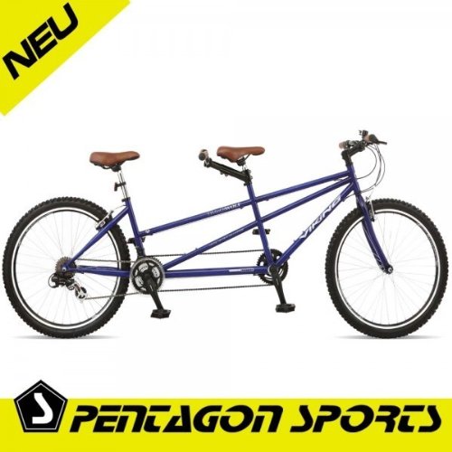 Description: This Viking adult tandem mountain bike is an ideal cycle for couples, friends or parents who prefer to share the experience of a cycle ride. Constructed from oversize Hi-Tensile Steel tubing, mated to oversize forks to take the rigours of trail riding. With a adjustable rear stem and low rear stand over height, the Timberwolf provides riders of differing, sizes ages and abilities an opportunity to share longer rides. The Timberwolfs sturdy steel frame features an eccentric bottom bracket for easy chain tension adjustment. Up front it features an oversize steel fork for precise control. Equipped with 21 speed shimano gears for easy shifting and powerful front and rear V type brakes it offers a great introduction to tandem riding.
